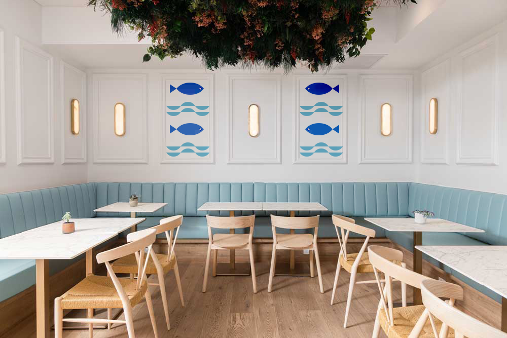 Beach Safari has a Mediterranean influence. I drew strong inspiration from ancient Mediterranean ocean waves and fish mosaic tiles.